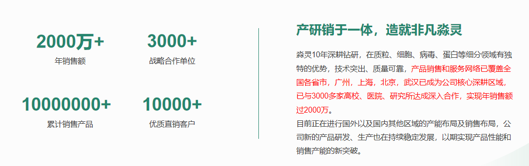 武汉淼灵生物科技有限公司(简称“淼灵生物”),成立于2014年6月,是专业从事生物技术服务及生化试剂研发、生产和销售的公司。我们致力于研发出质优价适的精品试剂,打破国内企业在低端恶性竞争、国外公司漫天要价的痛心局面,不断开拓国内外市场,成为中国生物公司里的海尔和华为,国外生物公司中的ATCC和addgene。