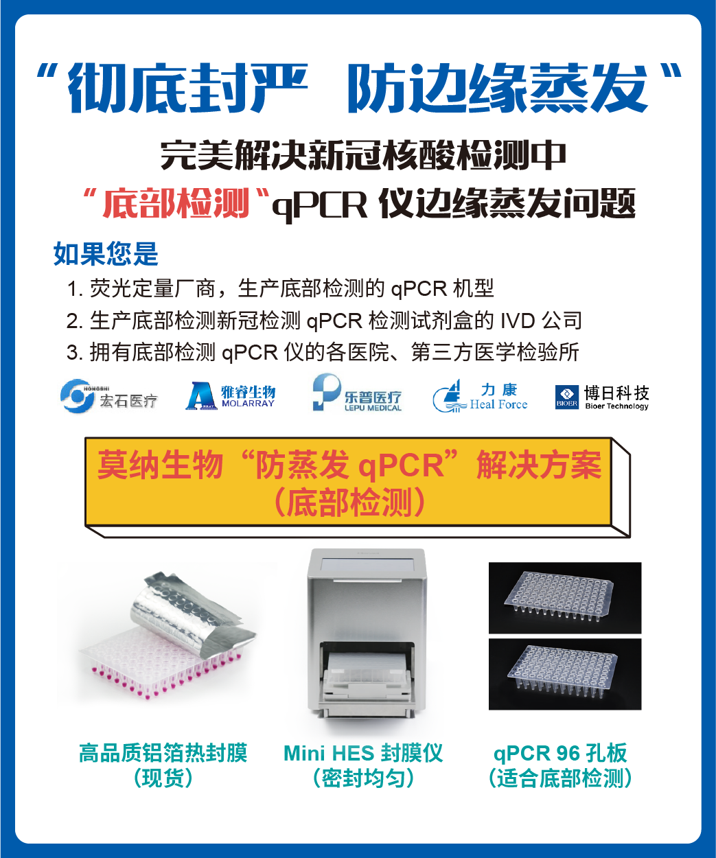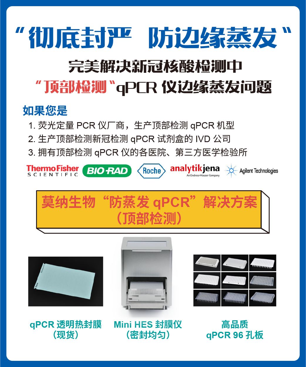 根据qPCR仪不同的荧光信号读取方式,莫纳生物提供“顶部检测”及“底部检测”qPCR检测的热封方案;包括:Mini HES封膜仪、铝箔热封膜、透明热封膜及不同类型的孔板。