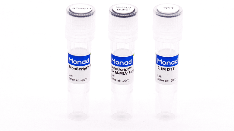 三代逆转录单酶MonScript™ RTase III 是通过基因修饰和重组技术获得的第三代M-MLV 逆转录酶。该酶相对于野生型M-MLV 逆转录酶去除了RNase H 活性,并大幅提高了热稳定性(最适反应温度为50℃),从而大大提高了合成第一链cDNA 时的特异性和长度(最长可达12 kb),增强了对RNA 复杂二级结构的耐受性。