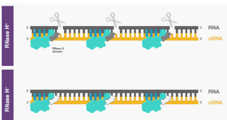 一般情况下,病毒的逆转录酶会连接一个 RNase H 活性结构域。RNase H 活性可能会与逆转录酶的活性聚合酶相互竞争 RNA 模板,在 cDNA 合成过程中同时切割 RNA : cDNA 杂合链中的 RNA 模板。因此在全长逆转录完成之前RNA 模板很有可能被降解掉。为了更好地合成 cDNA,提高逆转录效率,会在逆转录酶的 RNase H 结构域中引入突变,从而使逆转录酶的 RNase H 活性降低甚至完全消除。这种突变常常可以增加长链 cDNAs 的产量,促进其合成。所以在长片段 cDNA 合成过程中 RNase H 活性是必须要考虑且是需要规避掉的因素。