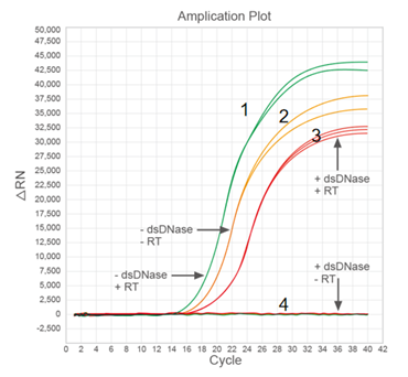 为什么要去除基因组 DNA 的污染呢?如下图,反应 3 是去除基因组进行逆转录的实验结果,反应 4 是去除基因组不进行逆转录的实验结果,反应 3 和反应 4 的结果就是正常的实验结果。但是我们看反应 1 和反应 2,他们分别是不去除基因组进行逆转录和不去除基因组不进行逆转录的实验结果,发现他们两个在所做的荧光定量实验中都检测出了信号。由此可看出,基因组 DNA 的残留对 qPCR 结果会造成很严重的影响。所以我们在实验中应该尽可能的把基因组 DNA 去除掉,从而保证我们数据结果的准确性。