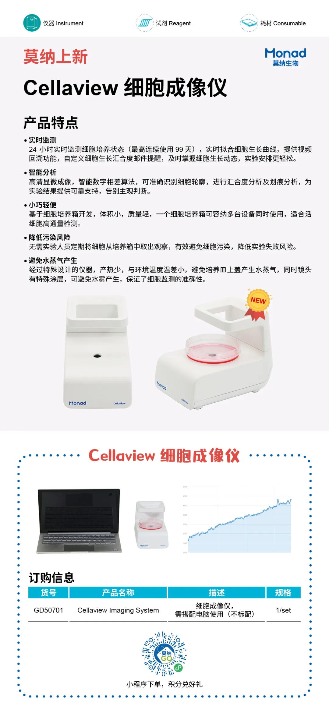 基于细胞培养箱开发,体积小,质量轻,一个细胞培养箱可容纳多台设备同时使用,适合活细胞高通量检测。