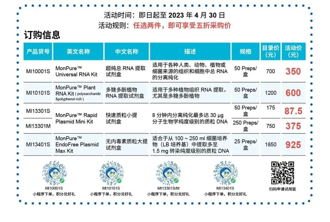 多糖多酚植物 RNA 提取试剂盒(MI10101S)可从 50-200 mg 植物组织,特别是富含多糖多酚或淀粉的植物组织(如棉花叶片、成熟水稻、拟南芥种子、马铃薯、月季、苹果等)中分离纯化总 RNA。
