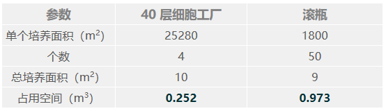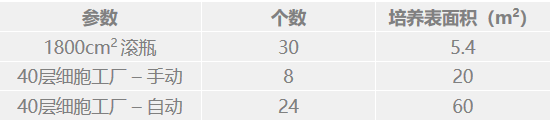 通过表中对比可见40层细胞工厂的培养面积远远高于滚瓶,