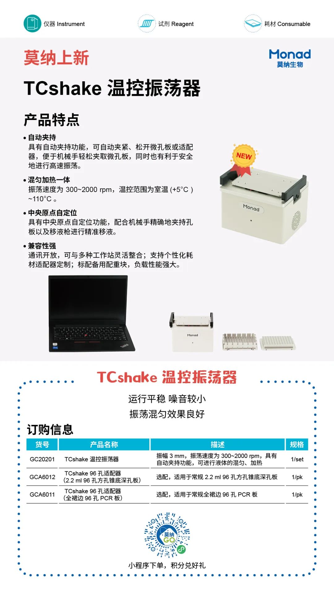 TCshake 温控振荡器集混匀与加热功能于一体,振荡速度为 300~2000 rpm,温控范围为室温(+5℃)~110℃,运行平稳,噪音较小,振荡混匀效果良好。