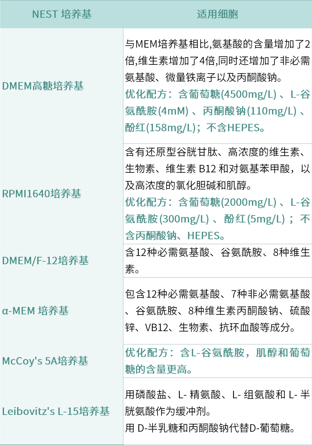细胞培养基有很多种,其中 DMEM、 RPMI 1640、 MEM 、 DMEM/F12 都是应用最广泛的培养基。其他如:M199 、 IMDM 、 L15培养基等也用于某些细胞的培养。