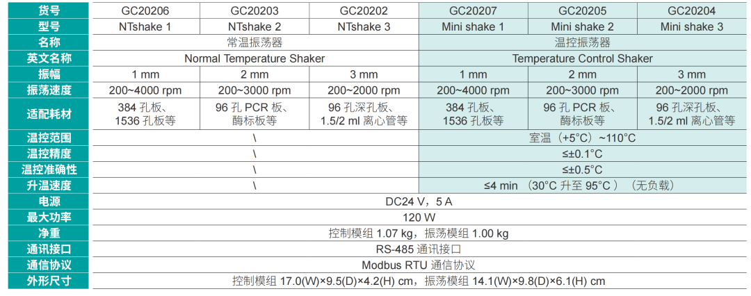NTPro shake 常温振荡器系列,有三种振幅(3mm、2mm、1mm)可选。具有自动夹持功能,无显示屏及单独的控制模组,通过 RS-485 通讯接口连接上位机进行控制。