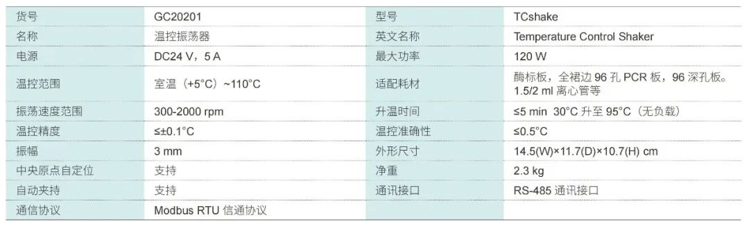 TCshake 温控振荡器集混匀与加热功能于一体,振荡速度为300~2000 rpm,温控范围为室温(+5℃)~110℃,运行平稳、噪音较小,振荡混匀效果良好。具有自动夹持功能,无显示屏及单独的控制模组,通过 RS-485 通讯接口连接上位机进行控制。