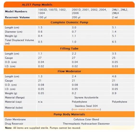 ALZET 共有3 个容量尺寸,12 个型号的渗透压泵。