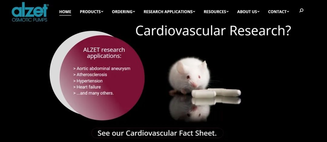 肝脏、脾脏等其它脏器、肿瘤或创伤处、中枢神经系统),Alzet 渗透压缓释泵已成功运送上百种药剂,包括蛋白质、多肽、生长因子、抗生素、化疗药、激素、类固醇、siRNA 以及其他短效期的化合物。在心血管疾病及神经系统疾病的研究中, 通过ALZET Osmotic pumps 持续给药可以建立多种疾病的动物模型, 如高血压及Parkinson 帕金森病的动物模型。加上成千上万篇的文献支持,使其在动物体内给药、动物模型建构、药物及分子筛选、药理药代药效等众多领域发挥着不可替代的作用。