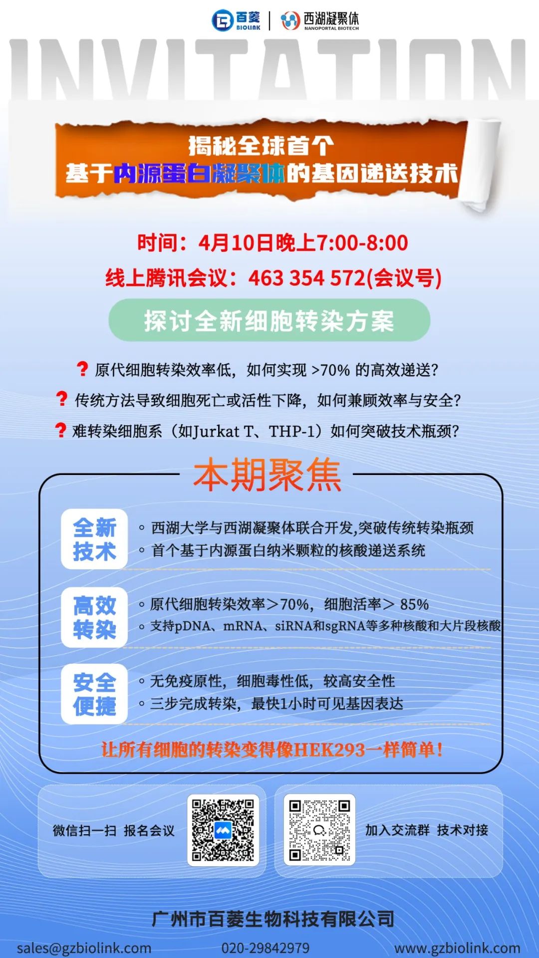 4月10日(周四)晚19:00-20:00,我们诚邀各位科研相关工作者、爱好者参加由百菱生物 & 西湖凝聚体联合举办的线上技术交流会。一起探讨全新细胞转染技术、基因递送新思路,在线互动,实时解答您的科研疑问!🎯