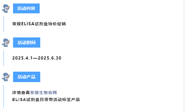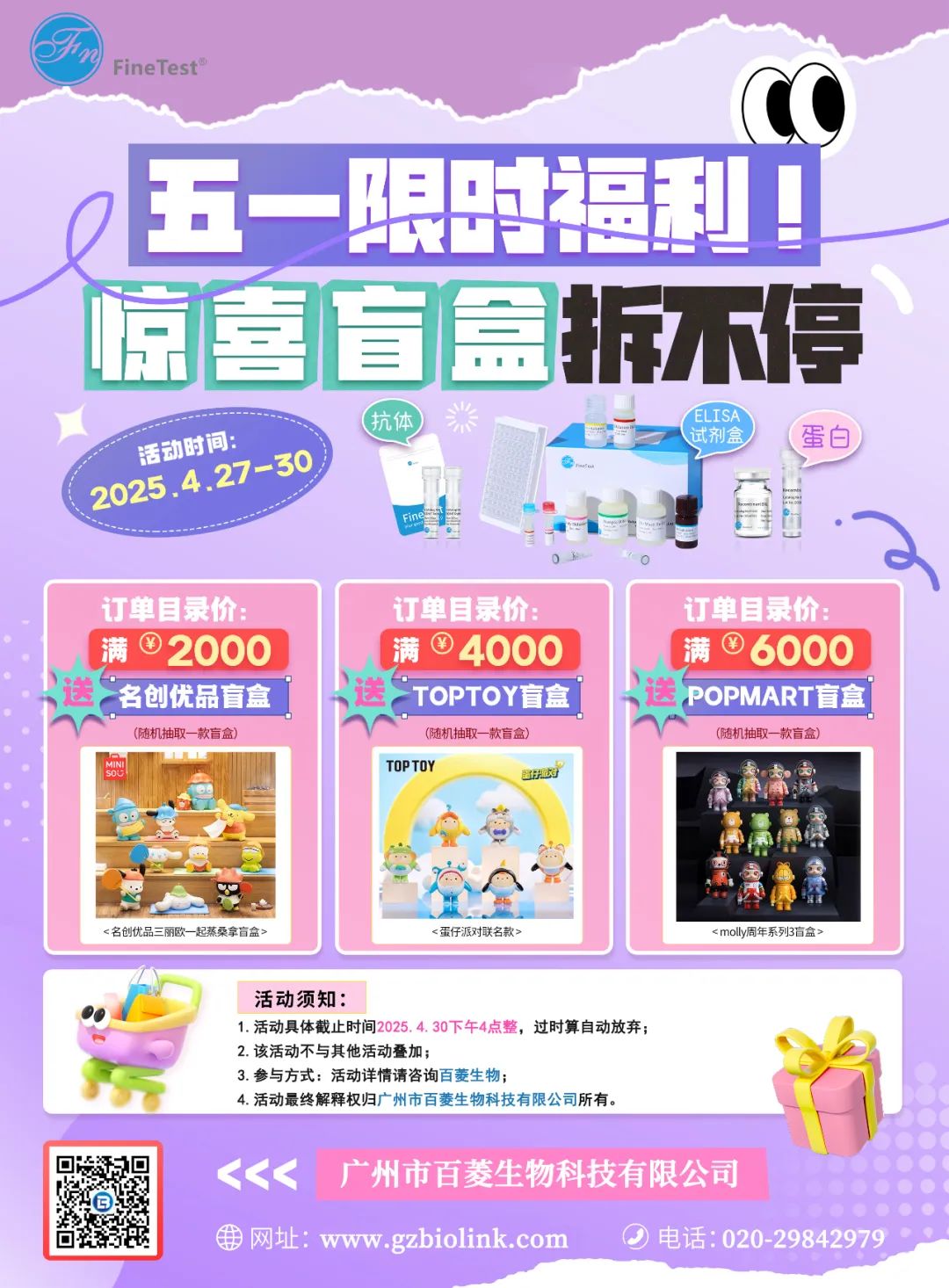 菲恩生物:“五一福利、惊喜盲盒拆不停”、“流式抗体买二送一”、“细胞功能试剂盒买二送一”、“快速检测ELISA试剂盒96T一口价”、“ELISA试剂盒特价促销”;
