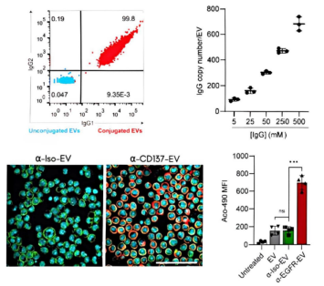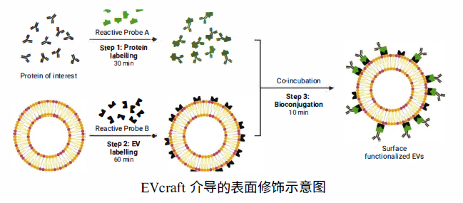 EVcraft外泌体表面修饰试剂盒(Cat.No.: JOT-EV-SM1)是一种利用前沿生物共轭技术的新型试剂盒。该试剂盒可用于将各种功能分子偶联到 EV 表面,用于一系列应用,包括但不限于:1、抗体或纳米抗体,以实现 EVs及其相关载药的抗原特异性细胞靶向;2、配体,如激动分子或细胞因子参与同源受体的细胞刺激;3、抗吞噬蛋白延缓/阻止 EVs的吞噬清除;4、报告基因或荧光探针准确跟踪EVs。