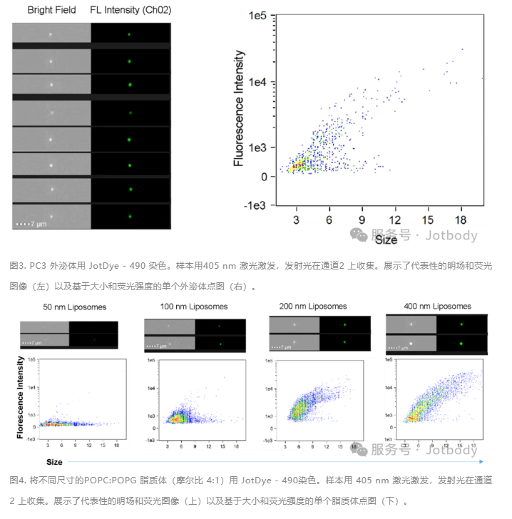 结果:图3显示60倍放大下,单颗粒外泌体荧光强度与粒径呈线性相关(R²=0.92)。图4显示脂质体挤出不同粒径(50-200 nm)后,JotDye-490荧光信号稳定,验证染料对粒径无偏好。
