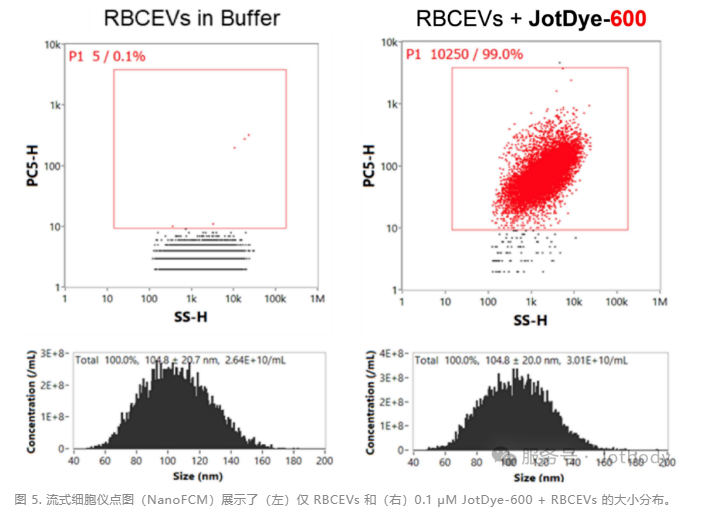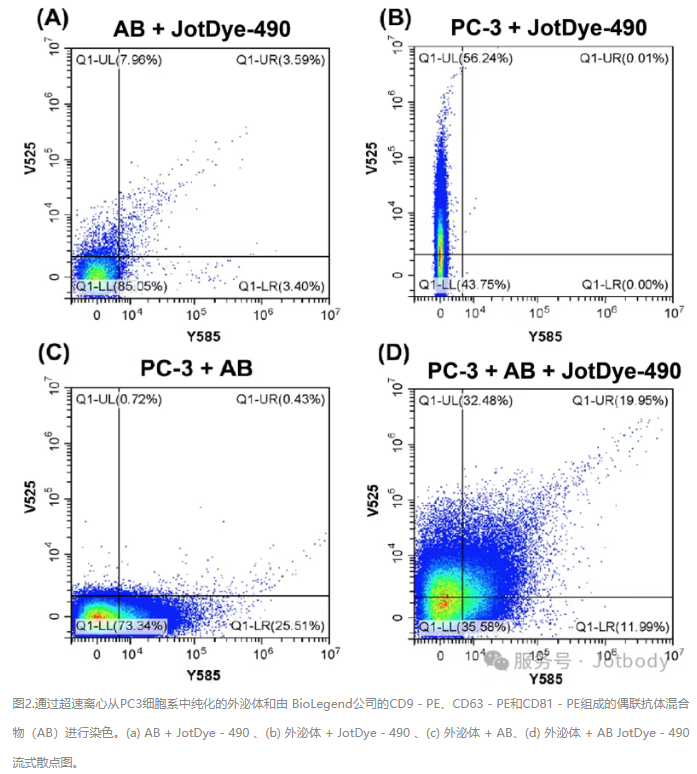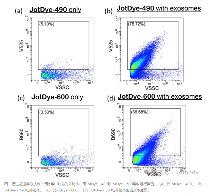 结果:图1显示仅染料组(阴性对照)与EV+染料组信号分离清晰,无背景干扰。图2显示多色共染无光谱串扰,流式散点图分群明确,表明JotDyes可与市面上常见的荧光抗体兼容。