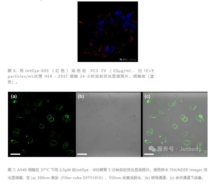 结果:图6显示EVs红色荧光(JotDye-600)精准定位胞内囊泡,与核信号(蓝色)无重叠。图7显示JotDye-490标记细胞膜,荧光信号与明场图像高度重合。