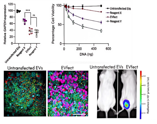 EVfect外泌体转染试剂盒(Cat.No.: JOT-EV-T1)是一种专门设计用于将核酸高效载入预纯化外泌体的试剂盒。该试剂盒已被验证可用于装载多种核酸,包括反义寡核苷酸(ASOs)、siRNA、 miRNA、mRNA和质粒DNA,适用于体外和体内实验。