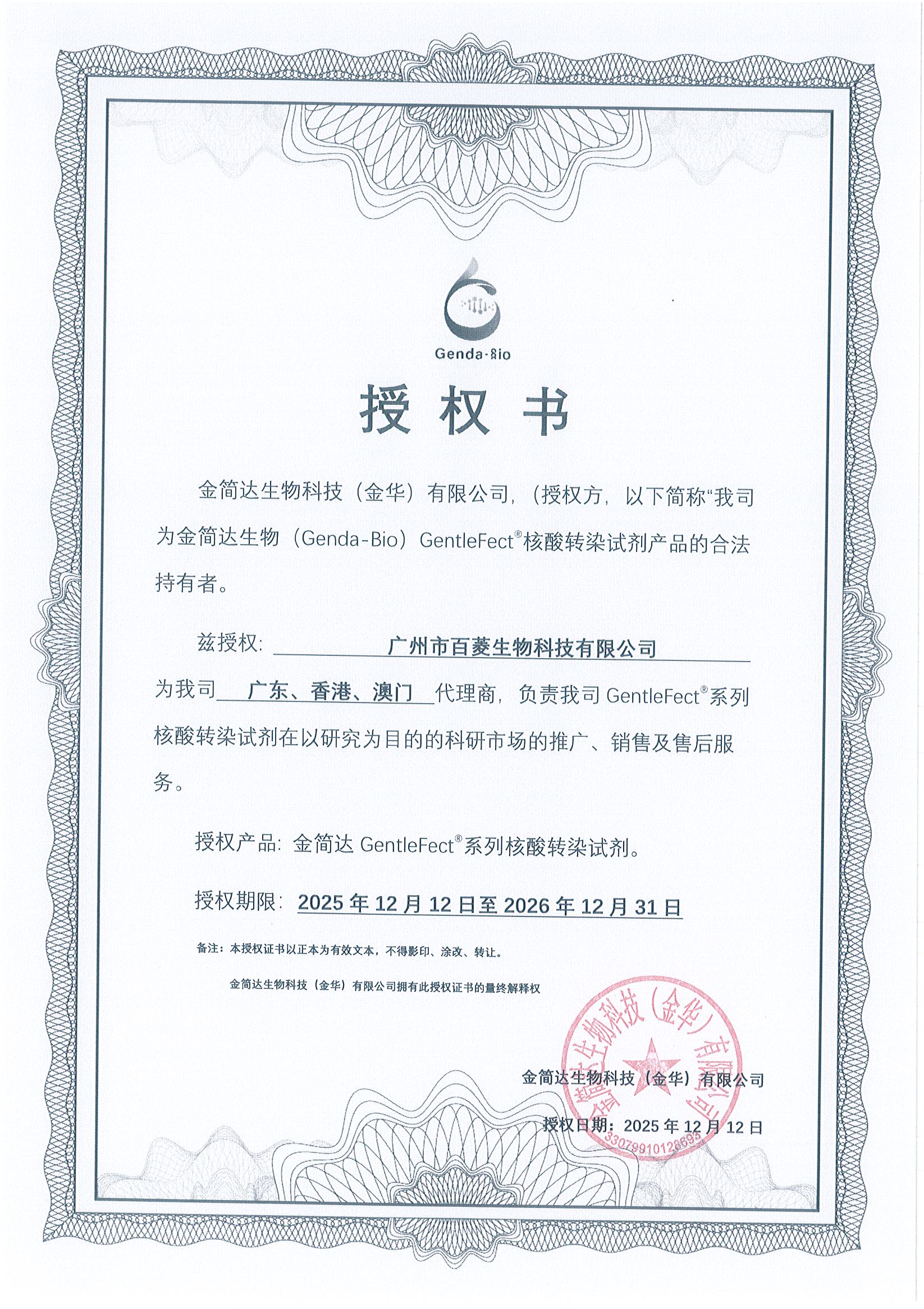 广州市百菱生物科技有限公司作为金简达生物的授权代理商,将与品牌方合作,携手服务好每个科研客户,负责旗下品牌的产品咨询、销售以及售后服务。