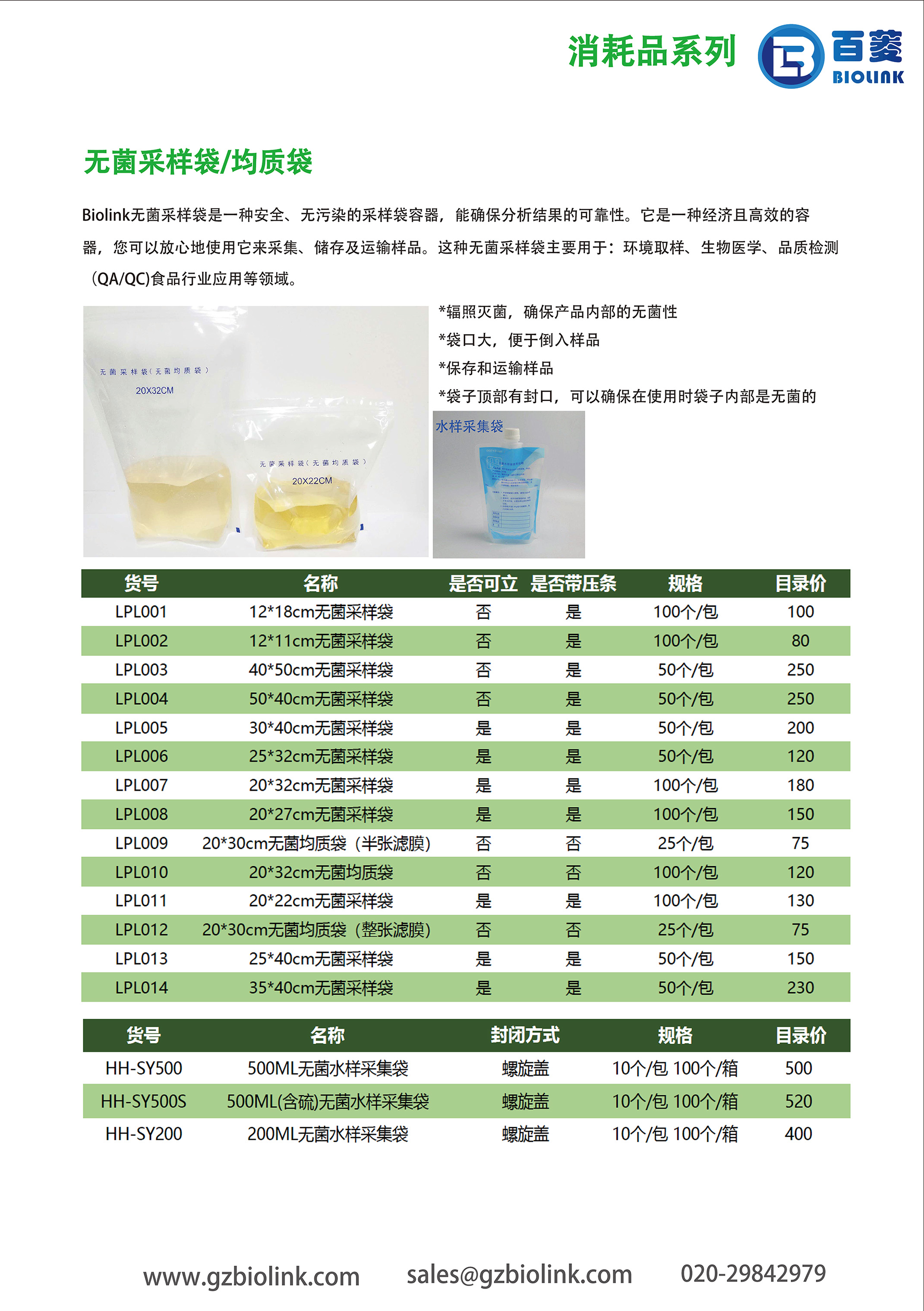 BIiolink 无菌采样袋是一种安全、无污染的采样袋容器,能确保分析结果的可靠性。它是一种经济且高效的容器,您可以放心地使用它来采集、储存及运输样品。这种无菌采样袋主要用于:环境取样,生物医学、品质检测(QA/QC)食品行业应用等领域。