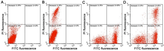 图2.细胞用本试剂盒染色后流式细胞仪检测效果验证图。Jurkat细胞用10μM喜树碱(Camptothecin)作用4小时后,未经染色(A)、仅用本试剂盒中的PI进行染色(B)、仅用本试剂盒中的Annexin V-FITC进行染色(C)、用本试剂盒中的Annexin V-FITC和PI进行双染(D)。从图中可以看出,未经染色的是双阴性细胞(A),仅PI染色后出现了预期的PI染色阳性的细胞,仅Annexin V-FITC染色出现了预期的Annexin V-FITC染色阳性的细胞,Annexin V-FITC和PI双染出现了预期的仅Annexin V-FITC染色阳性的凋亡细胞和双阳性的坏死细胞。出现的非预期的细胞点完全在许可的误差范围内。实测数据可能会因细胞类型、细胞凋亡情况、检测仪器等的不同而存在差异,图中数据仅供参考。