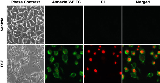 图3. Annexin V-FITC和碘化丙啶(PI)染色效果图。图中绿色荧光为Annexin V-FITC染色阳性细胞,红色荧光为碘化丙啶染色阳性细胞。仅被绿色荧光染色的为凋亡细胞,被绿色和红色荧光双染的是坏死细胞,未被荧光染色的为正常细胞。Vehicle组为阴性对照,Annexin V-FITC染色和碘化丙啶染色都非常弱,L-929细胞处于正常状态;TSZ组为阳性对照,L-929细胞用TSZ处理3小时。TSZ为TNFα、SM-164和Z-VAD-FMK组成的细胞坏死诱导试剂(C1058)。