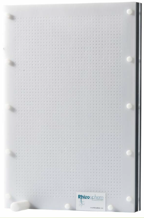 高33cm,宽22cm,厚(前后间距)4cm,为了便于实验观察和准确取样,前壁采透明玻设计,钻有约22]0个直径为0.6mm的小孔,小孔间距5mm,将土基质如琼脂、石英砂、珍珠岩、蛭石、岩棉、泥炭等填充后植入实验材料,如小麦、玉米、水稻、茄子、竦椒、黄瓜等。能够万便准确提取不同生长阶段、不同位点的根系分泌物。