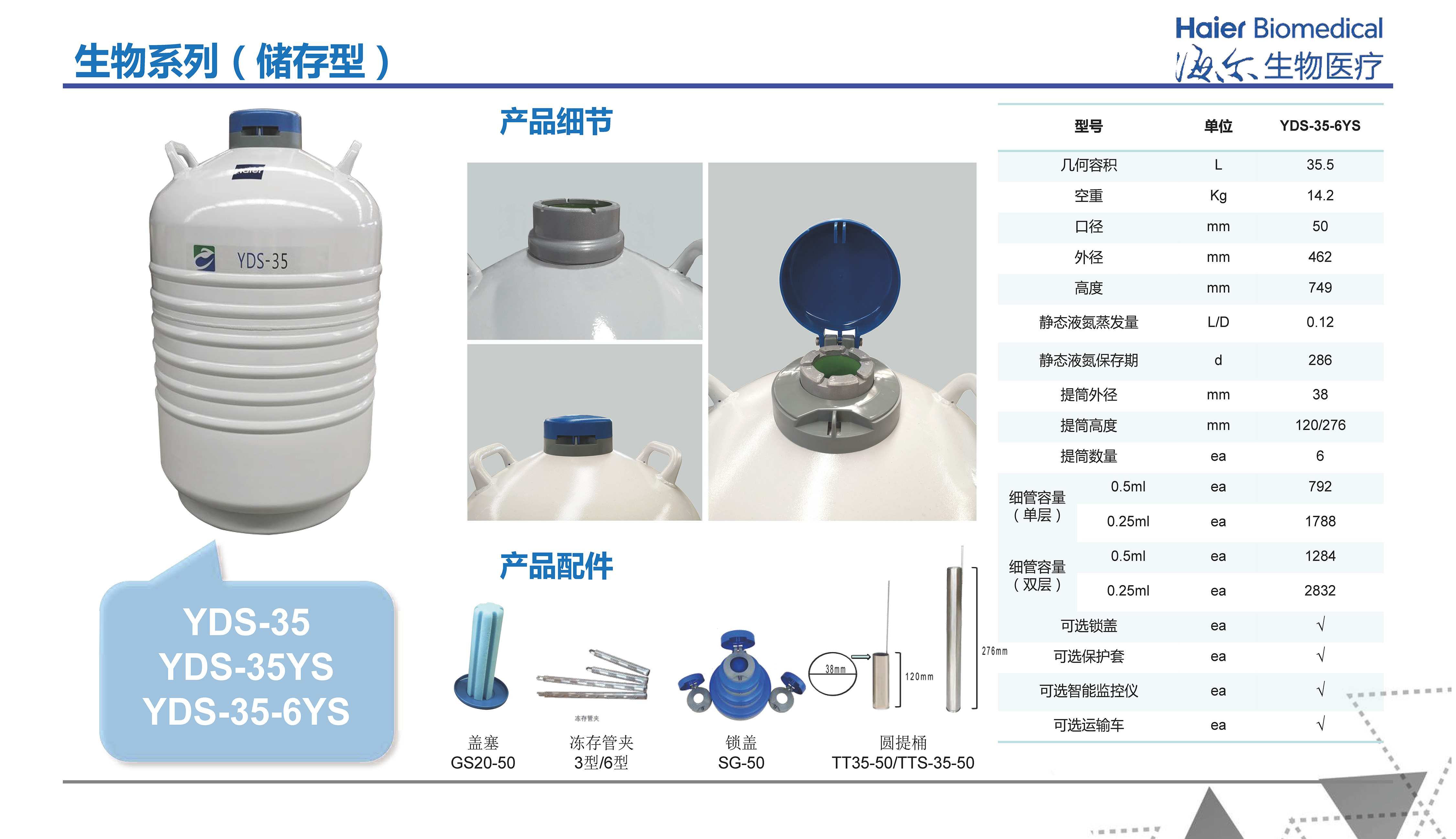 | YDS-35 | 液氮生物容器 | YDS-35-6YS | 标配6个276MM圆提筒;含保护套;含锁盖,可选配运输车 |