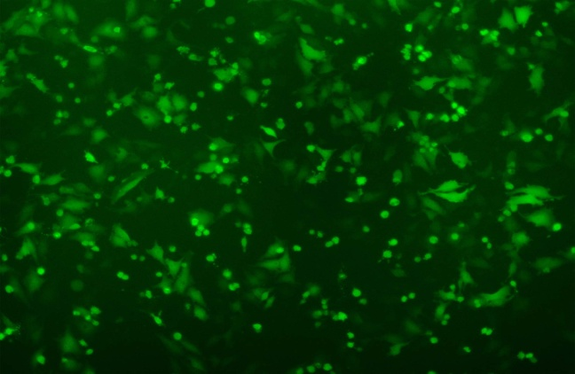 图A Lipofect5000 转染0.8ug GFP质粒于Hela细胞,转染阳性率高达90%