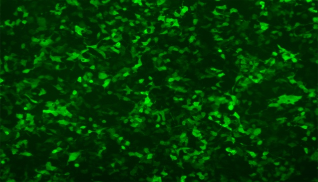 图 RFect 293 2.5ul转染0.8ug pEGFP-C2质粒到AAV-293细胞后,绿色荧光蛋白的表达情况