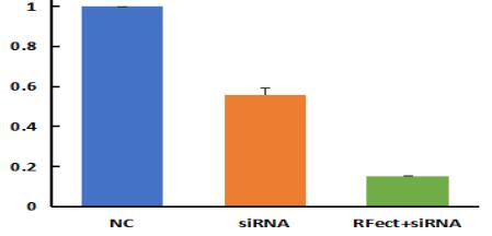 图 Elite Fect-I包裹20pmol c-myc siRNA,直接注射入裸鼠胸壁种植的MCF-7乳腺癌瘤体内,48小时后取瘤体组织,qPCR检测其c-myc mRNA的表达情况。