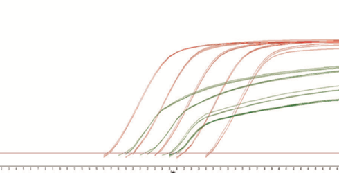 图. 以人的总RNA为模板,10倍系列稀释,一步法扩增ubiquitin基因的一个片段,每个反应重复3次。红线为BIOGHC ElitefastSYBR One Step Kit的扩增结果,绿线为国内另一品牌供应商的扩增结果。可见,BIOGHC Elitefast SYBR One Step Kit反应更为灵敏,线性范围宽,稳定性好。
