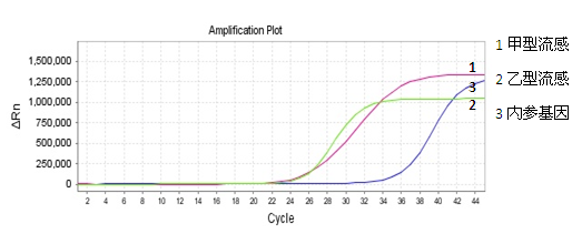 图.2 BIOGHSC Super MultiProbe One Step Kit 流感多重检测扩增曲线图: 1为甲流病毒检测曲线,2为乙流病毒检测,3为内参基因。可见,使用BIOGHSC Super MultiProbe One Step Kit进行多重检测,S型曲线更加典型,酶动力较强。