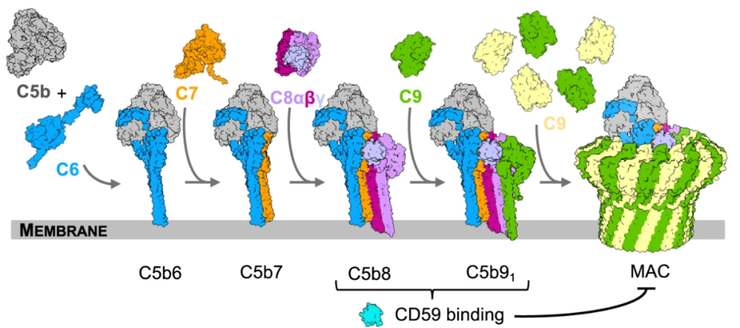 MAC 由 C5b、C6、C7、C8、C9 五种补体蛋白逐步结合组装而成。CD59 通过结合 C8 的 β- 折叠结构域形成分子间 β- 片层,阻止 C9 插入靶细胞膜及后续的 MAC 聚合,最终发挥抑制细胞溶解的功能。