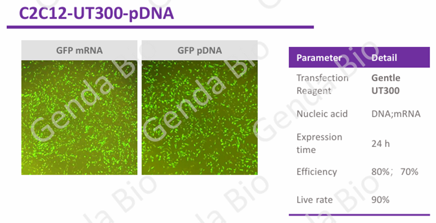 UT300采用的新型阳离子聚合物聚合力强,可高效浓缩核酸并吸附细胞膜,加速透膜过程与胞内核酸的快速释放,能在C2C12细胞中实现高效的核酸递送,保障转染效率。