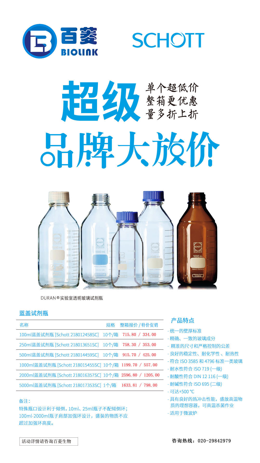 活动一:细胞培养系列满二送一, 购买活动参与品牌的细胞培养试剂耗材系列产品,满2万送1均可送Gibco南美胎牛血清(1瓶) 参与品牌有:Thermo , ScienCell , Solarbio , PromoCell , NEST
