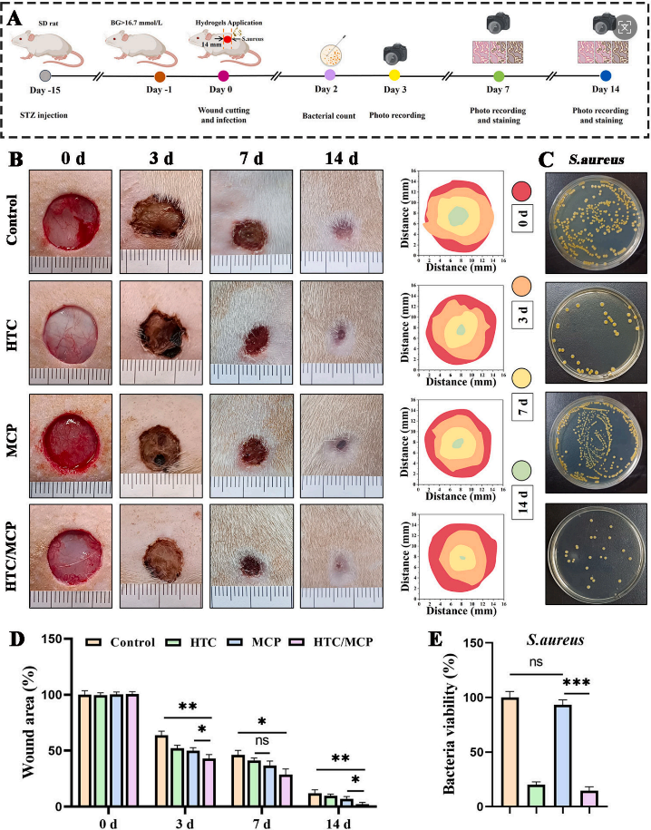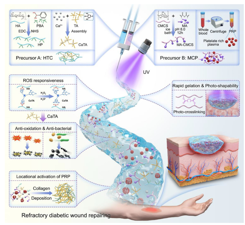 本研究成功开发了一种集成ROS响应、抗菌、抗炎、活化PRP及促血管生成等多功能于一体的智能双网络水凝胶HTC/MCP。该水凝胶能动态响应糖尿病伤口的高ROS微环境,按需释放治疗剂,并通过Ca²⁺激活PRP实现生长因子的持续供给。系统的体外与体内实验证实,其能有效清除感染、缓解氧化应激与炎症、并显著加速组织再生与血管重建,最终实现糖尿病感染伤口的快速愈合。该工作为设计下一代适用于复杂慢性伤口的主动式、一体化治疗材料提供了创新思路与实验依据。