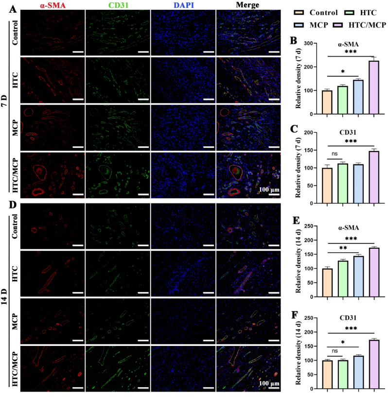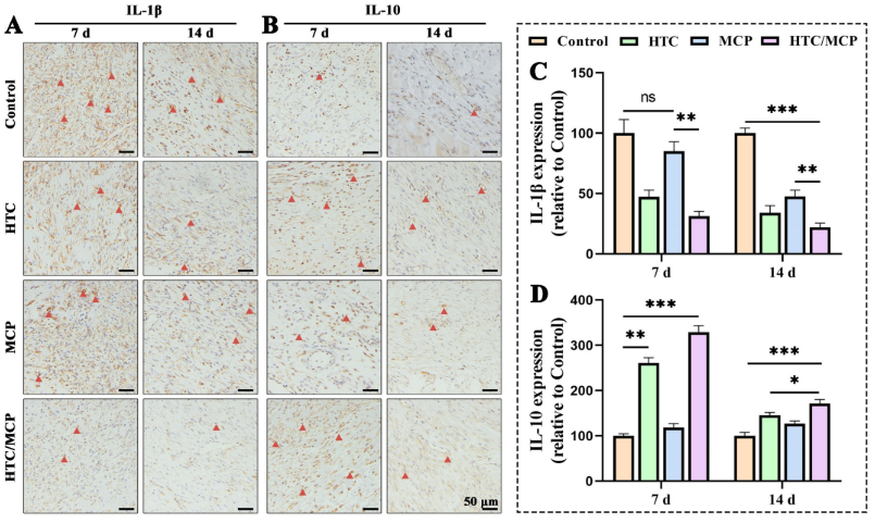 最后,研究在糖尿病大鼠全层皮肤感染缺损模型中验证了HTC/MCP的综合治疗效果。如 Fig 7所示,HTC/MCP治疗组的伤口愈合速度显著快于其他对照组,至第14天闭合率接近95%,并能在早期有效控制伤口细菌数量。组织学分析揭示了其促进愈合的深层机制:Fig 8的染色结果显示,该水凝胶能促进更快速有序的胶原沉积;Fig 9的免疫组化表明,它可下调促炎因子IL-1β、上调抗炎因子IL-10,有效调控伤口炎症微环境;Fig 10的免疫荧光则直观显示,HTC/MCP能显著增强伤口部位新生血管的标志物表达,从而改善组织血供与营养输送。这些多方面的协同作用,共同促成了糖尿病感染伤口的优质修复。