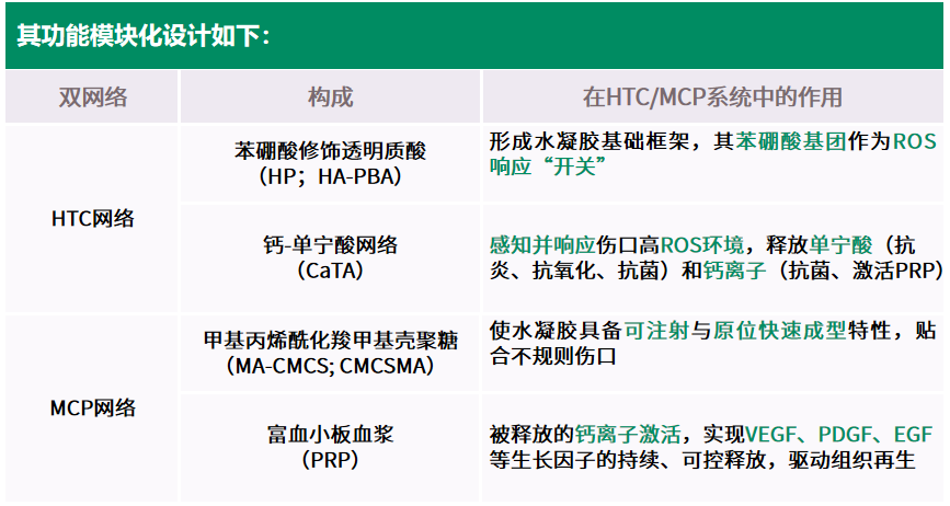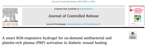 本期,EFL以发表在期刊《Journal of Controlled Release》的“A smart ROS-responsive hydrogel for on-demand antibacterial and platelet-rich plasma (PRP) activation in diabetic wound healing”研究为例,解读如何开发ROS响应性双网络水凝胶(HTC/MCP)。该水凝胶通过动态硼酸酯键设计,在炎症高ROS环境中智能解离,快速释放单宁酸清除自由基、抗炎抗菌;同步释放的钙离子则原位激活内源性PRP,实现生长因子(VEGF、PDGF等)的持续缓释,从而时序性协调“抗炎-抗菌-促再生”过程。