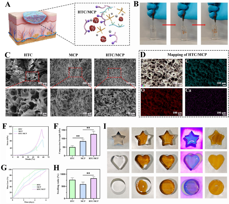 接下来,将HTC与MCP前体溶液混合,通过紫外光引发交联,最终制得稳定的双网络复合水凝胶HTC/MCP。对其性能的表征显示:该水凝胶具有良好的 注射性 和 形状适应性,能贴合不同轮廓的伤口并快速固化(Fig 3B, I);其内部呈现均匀的多孔结构(Fig 3C-D),并具备优于单组分的机械强度(Fig 3E-F)及可控的降解与溶胀行为(Fig 3G-H)。关键的 ROS响应性释放 功能通过 Fig 2D-G得到验证:在模拟炎症环境(含H₂O₂)中,硼酸酯键断裂,加速释放CaTA;同时,释放的Ca²⁺可有效激活PRP,从而在长达6天的时间内持续、稳定地释放VEGF、PDGF、EGF等关键生长因子。