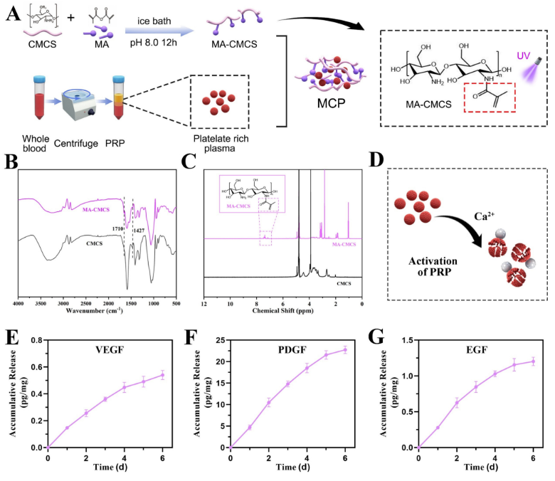 另一方面,为使水凝胶具备临床易用的成型能力,研究将甲基丙烯酸酐(MA)接枝到羧甲基壳聚糖(CMCS)上,合成了可光交联的MA-CMCS,其化学结构变化通过Fig 2B-C的FTIR和¹H NMR得以验证。随后,将其与富含生长因子的PRP复合,构成MCP网络(Fig 2A)。