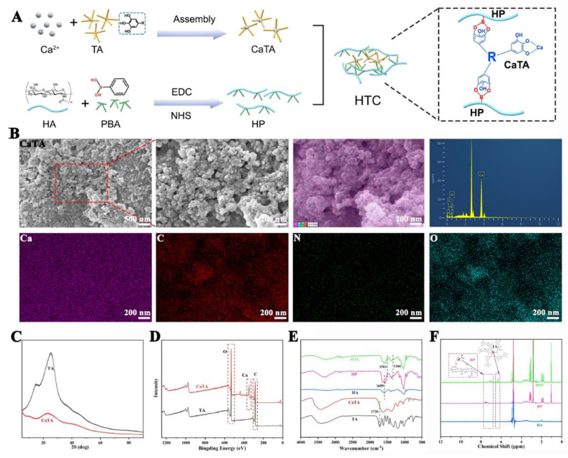 本研究首先成功构建了双网络水凝胶的两个前体组分,并对其进行了系统表征。如Fig 1A所示,钙离子与单宁酸通过配位作用形成CaTA纳米颗粒(Fig 1B),进而与苯硼酸修饰的透明质酸(HP)通过动态硼酸酯键自组装,形成具有ROS响应潜力的 HTC 网络。Fig 1C-F的XRD、XPS、FTIR及¹H NMR数据共同证实了CaTA的成功合成与HP的有效修饰。