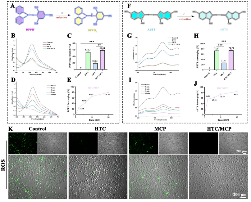 完成材料学表征后,研究在细胞水平评估了其生物学功能。Fig 4A-C的结果表明HTC/MCP具有优异的细胞相容性,并能促进细胞增殖。更为重要的是,它能显著加速成纤维细胞的迁移(Fig 4D-H),并强力促进血管内皮细胞形成管状结构,显示出强大的 促血管生成潜力(Fig 4I-L)。此外,Fig 5中的抗氧化实验证明,水凝胶能有效清除自由基,缓解氧化应激。针对糖尿病伤口最常见的感染问题,Fig 6系列实验证实,HTC/MCP通过对细菌膜的双重破坏作用(Ca²⁺与TA协同),对金黄色葡萄球菌和大肠杆菌实现了超过99%的高效抗菌。