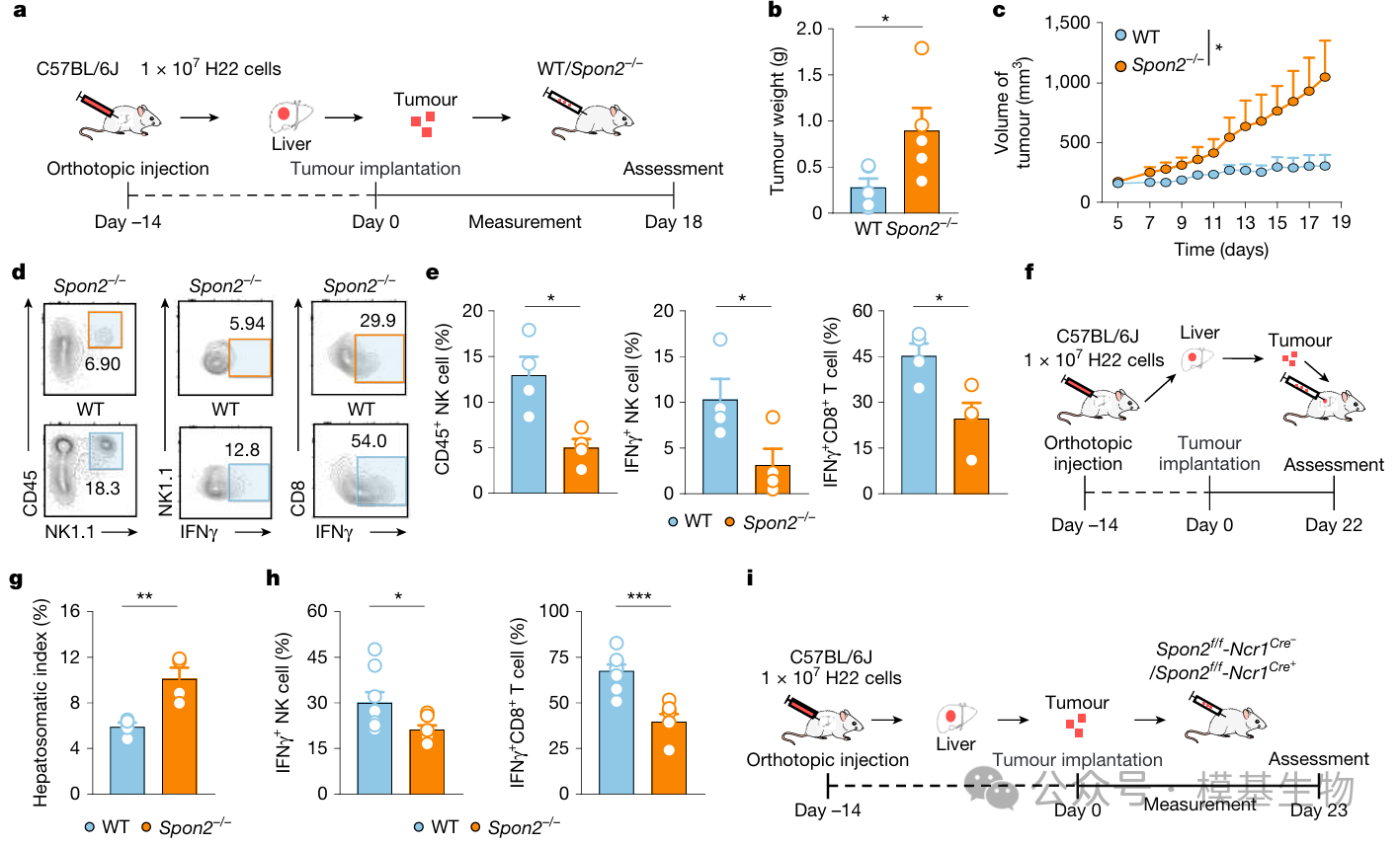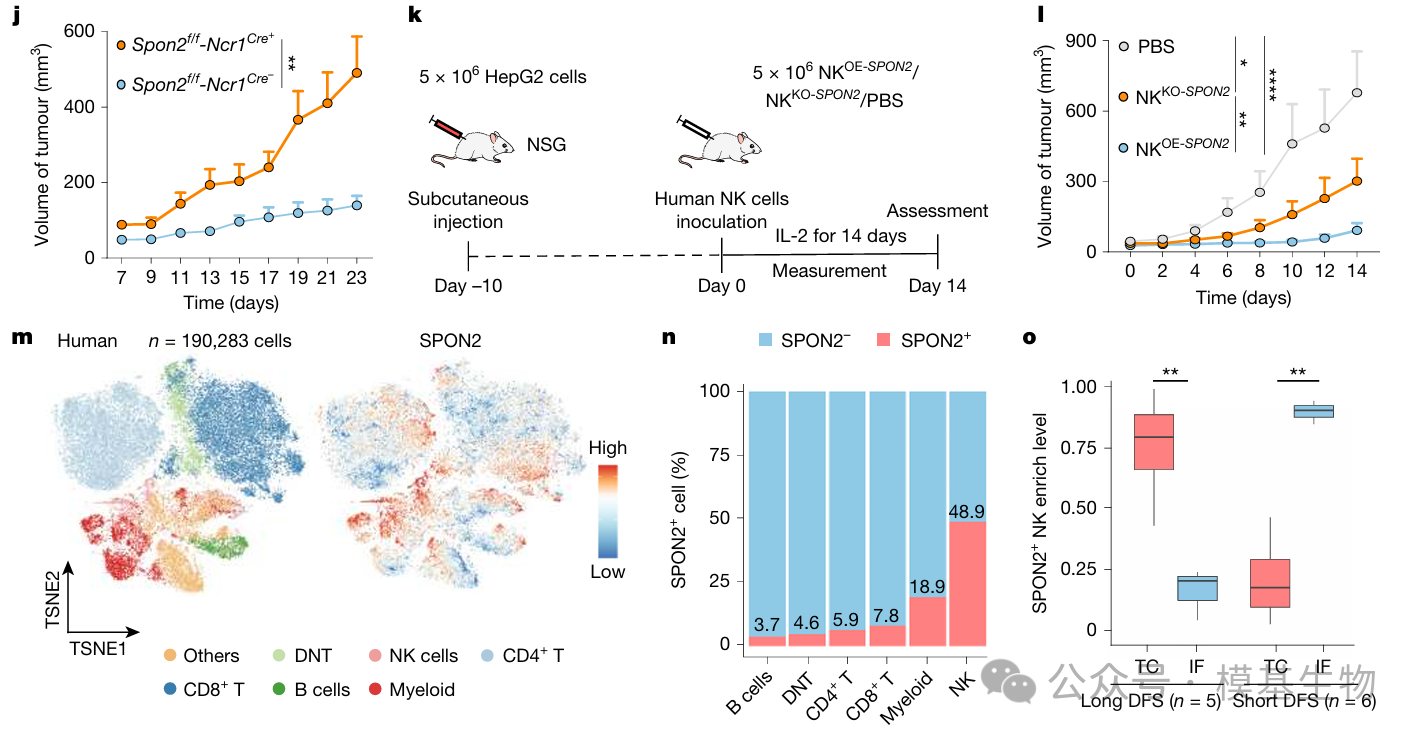 图5:通过多种HCC小鼠模型、NK细胞特异性敲除、人源NK回输以及患者样本分析,系统证明了SPON2⁺ NK细胞在体内具有明确的抗肿瘤作用。SPON2的缺失会导致NK细胞浸润和IFNγ产生能力下降,进而削弱CD8⁺ T细胞效应功能,最终加速肿瘤进展并增加复发风险。