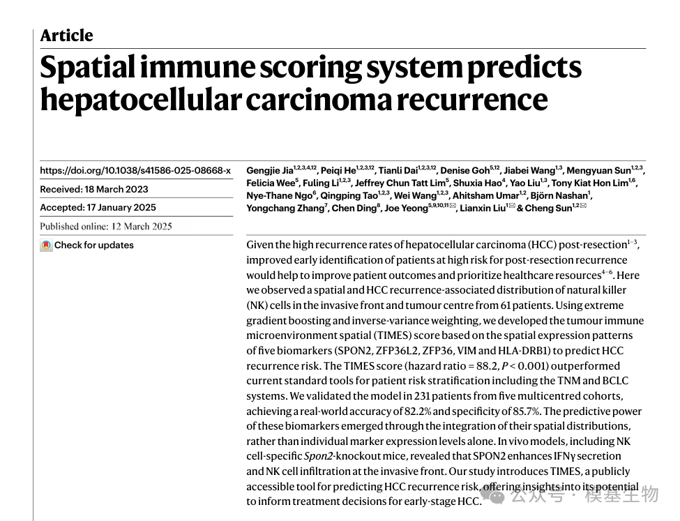 研究团队通过整合空间转录组、多重免疫组化与AI全切片分析,构建了基于NK细胞空间分布的TIMES评分系统,展现出显著优于TNM和BCLC的预测能力,为肝癌精准预后评估提供了全新范式。