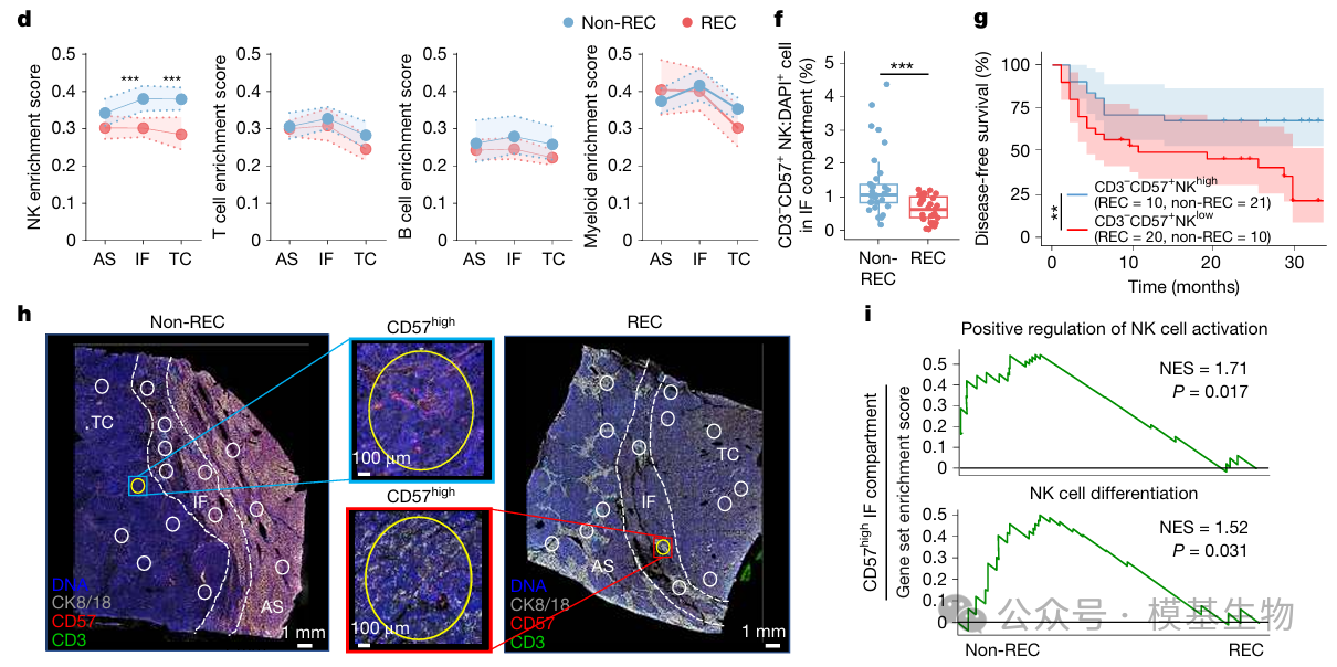图1:通过空间转录组与多重免疫组化分析,研究发现非复发患者(non-REC)在肿瘤侵袭前沿区域(IF, invasive front)显著富集NK细胞,且这一空间特征在独立大样本队列中得到验证(Fig. 1e)。进一步亚群分析表明,只有侵袭前沿的CD3⁻ CD57⁺成熟NK细胞与更长的无病生存期显著相关(Fig. 1g),提示肿瘤免疫防御的关键不在于免疫细胞总量,而在于特定免疫细胞亚群在关键空间位置的精确分布。