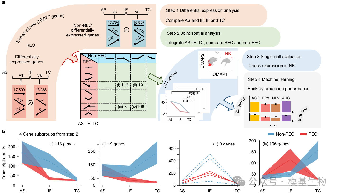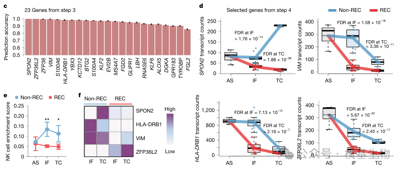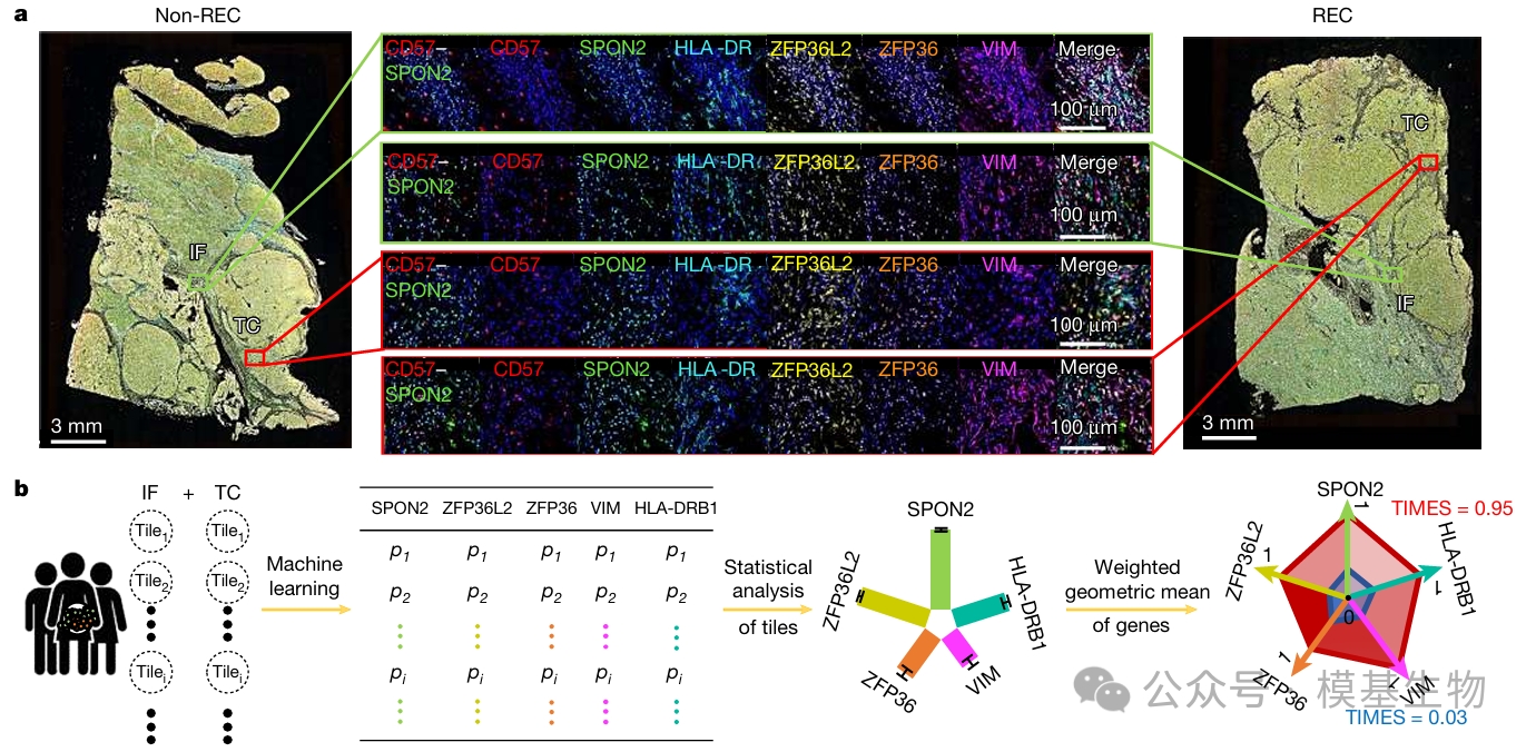 图2:研究在CD3⁻CD57⁺ NK细胞富集区域中识别出241个具有空间分布差异的基因(Fig. 2a-b),并进一步筛选出5个在侵袭前沿(IF, invasive front)和肿瘤中心(TC, tumour centre)具有最强复发预测能力的关键基因(SPON2、ZFP36L2、ZFP36、VIM、HLA-DRB1),这5个基因就是后续TIMES评分系统的核心biomarker。