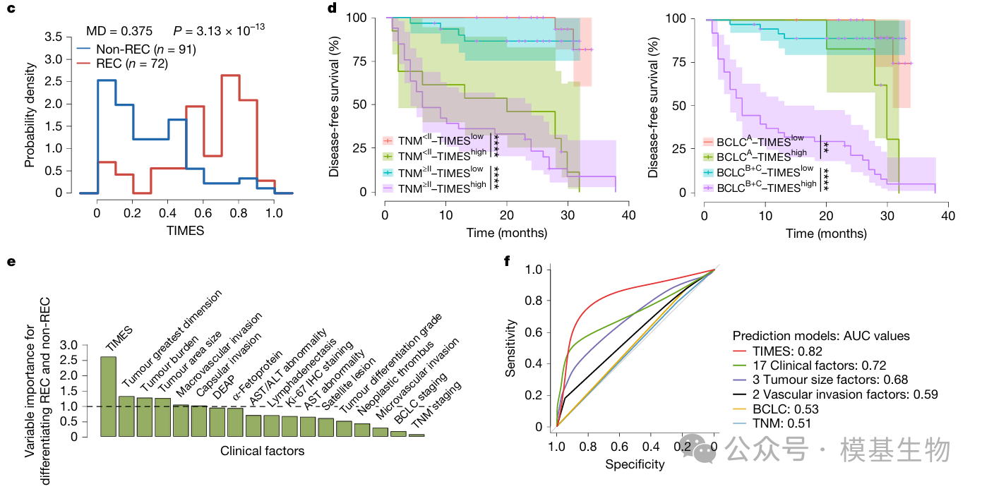 图3:研究基于多重免疫组化获取的高分辨率空间蛋白数据,利用机器学习算法整合IF与TC中五个关键biomarker的空间分布特征,构建了TIMES评分(Fig. 3a-b)。图3d中:TIMEShigh和TIMESlow是基于TIMES评分将患者分为高、低复发风险两组;DFS指无病生存期,即从手术到复发或死亡的时间。结果显示,TIMEShigh患者的DFS显著缩短,提示其术后更易复发;而TIMESlow患者DFS明显延长,表明预后更佳。即使在相同TNM或BCLC分期下,TIMES仍能进一步区分复发风险,显示出优于传统分期系统的预测能力。